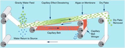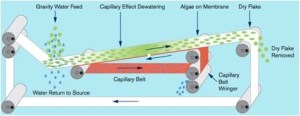 AlgaeVenture System公司於2009年開發出 @font-face { font-family: “新細明體"; }@font-face { font-family: “Cambria"; }p.MsoNormal, li.MsoNormal, div.MsoNormal { margin: 0in 0in 10pt; font-size: 12pt; font-family: “Times New Roman"; }div.Section1 { page: SectionHarvesting Dewatering and Drying Technology(HDD技術)為藻類收穫與乾燥提供了解答。 整個系統分為運輸帶(過濾帶)和吸水帶,運輸帶將藻體帶離水體並且在運輸的過程中進行過濾, 吸水帶由超吸水聚合物(Super absorbent polymer)製成,利用自然毛細現象以及水分子內聚力來進行收穫和除水,因而不需提供幫浦並且避免過濾時堵塞所產生的額外能量消耗。兩帶運行方向相反以促進除水效率。除此之外,整個系統僅需兩組直流馬達運作輸送帶及擠壓吸水帶,因此能量輸入極低,與傳統離心法相比,收集一噸生物質花費由3400美金減少至1.92美金。在測試機台中,每小時大約可過濾500公升藻液,然而過濾效率受機台大小 目標含水量 以及藻液初始濃度影響,須待進一步實驗才可得知確切效率。