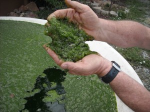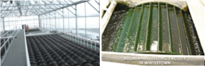 之前介紹過的AlgaeWheel也是一種開放式的養殖方式。圖中的實驗廠位於美國印第安納州,圖中溫室的主要功能為抵禦該地區冬季的酷寒,讓藻類在寒冷的冬天也能生長,並非防止其他微生物入侵。由輪底輸入氣泡造成藻輪轉動,因此附著於藻輪表面的藻體可以適當的接受陽光。當然曝氣(意思為「讓藻類與氣體接觸」)需要的能量會比轉動跑道池的水車還要多,但是AlgaeWheel同時兼具處理廢水以及產生生質燃料的功能,因此可以額外獲利,相比之下不一定吃虧。