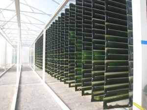 圖為Valcent公司在墨西哥建立的高密度直立式培養系統(High Density Vertical Growth System),利用塑膠材料製成立體懸掛式的封閉型培養反應器。懸掛直立式可以更妥善的利用空間與光線,塑膠材料降低了密閉式反應器的成本,個體式的培養袋也可減少被外來微生物污染的危害。然而需要個別曝氣來進行攪拌也造成較高能量花費,直立式懸掛則需考慮培養袋之間互相屏蔽的問題。
