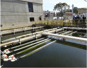 之前我們在2010年時介紹過NASA發展了OMEGA 離岸半透膜海藻養殖 ,經過兩年的試驗之後,NASA終於要在下禮拜發表他們新的進展:漂浮藻類養殖技術。如圖中所示,新的養殖系統與OMEGA系統最大的區別為NASA將原本的半透膜材料改成了PE管狀塑膠袋。據私下了解,原本的半透膜袋式培養在試驗過程中因強度不足、易造成破裂而造成藻體流失在海中。PE塑膠管在正常氣候下較不易有破裂的情形發生,然而仍須每年更換一次,更換下來的大量塑膠管仍需另外尋求方法處理。