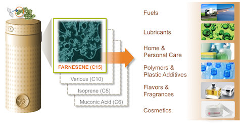 Biofene® 是 Amyris 技術平台的主要產品,它是一種以蔗糖為原料生成的 farnesene (trans-ß-farnesene),是含有15個碳的長鏈碳水化合物,可以作為許多商品的生產原料,包括:化妝品、香水、清潔劑、潤滑油、燃油…等。Amyris 將其生產基地設在蔗糖工業健全進步的巴西,以取得更有價格競爭力的原料,並於2012年12月正式進入量產階段。在巴西的生產計劃獲得 Total 三年共八千兩百萬美金 (82 million) 的挹注;而 Total 目前也持有 Amyris 18.5% 的股份,兩者有著很緊密的合作關係。