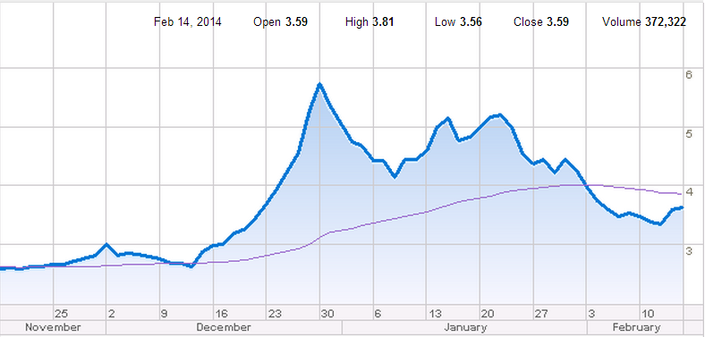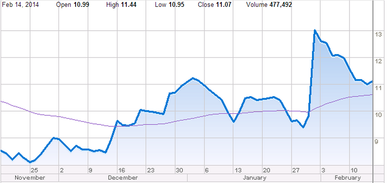 Solazyme去年11月時股價還盤旋在8 USD的谷底,其後持續攀升,在2014年初1月達到11 USD後掉落到9~10 USD之間震盪。然而Solazyme的股價並沒有持續疲軟,在1月31日一天之內向上猛衝,一度達到13.46 USD,最後收在12.97 USD,單日上漲32%。