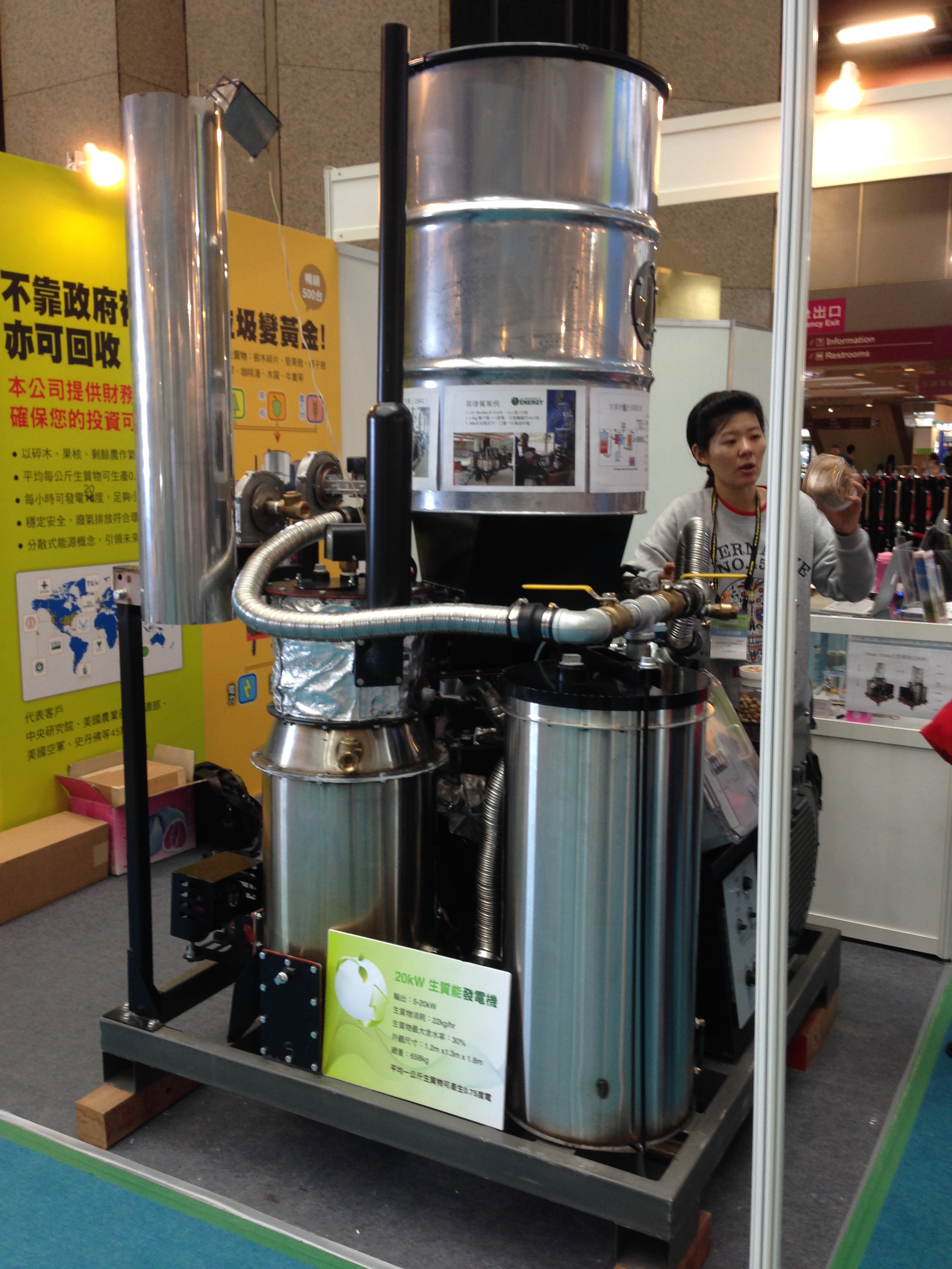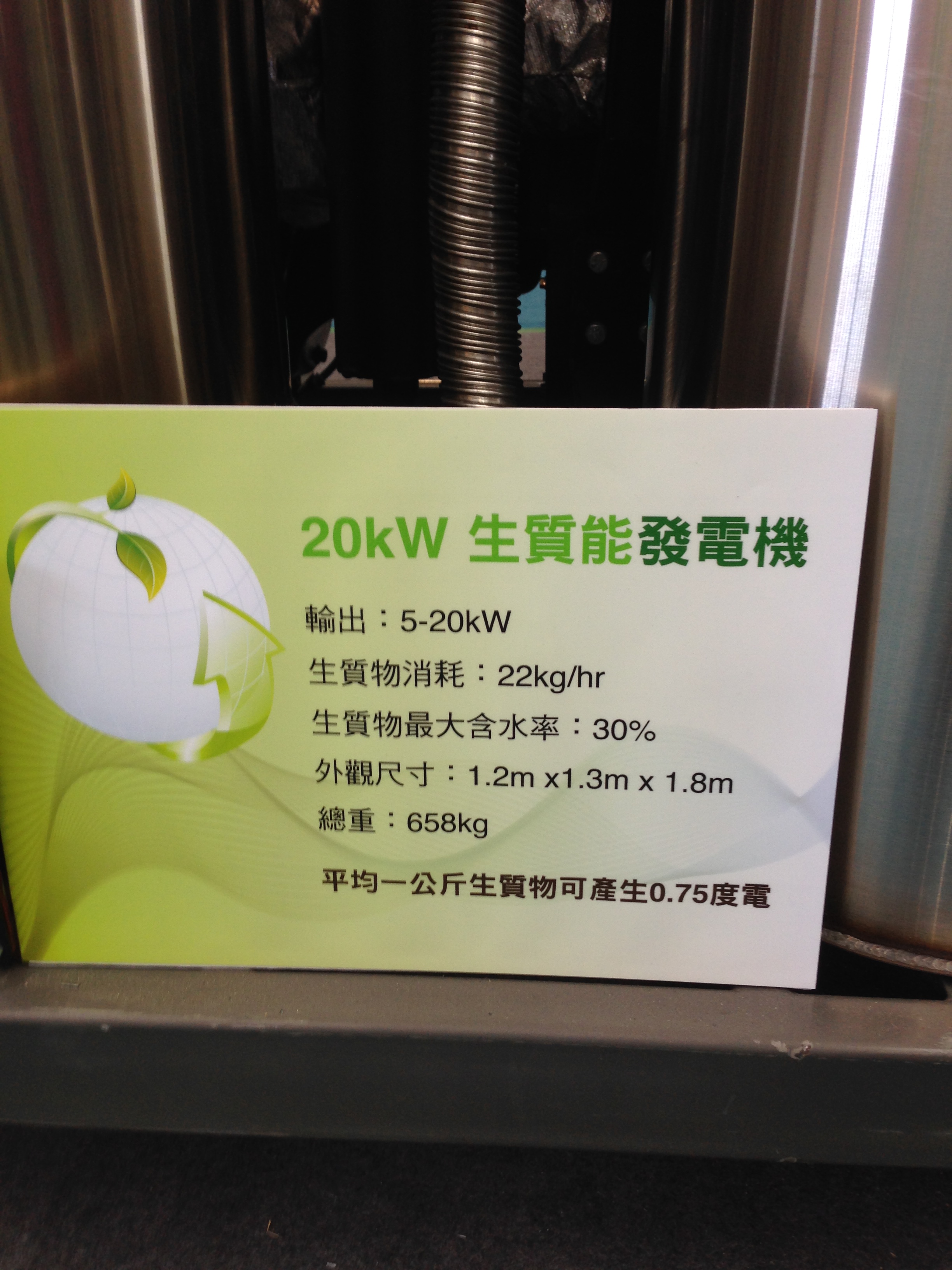 在靠近展場角落的地方,筆者發現了一台有趣的儀器。這是『宗宜企業有限公司』於2013年自美國引進的『生質物氣化發電機』。這次在現場展出的機型是20kw 生質能發電機,根據展場工作人員的介紹,這台生質能發電機適用的料源以農業廢棄物為主,包括:木材碎片、果殼、椰子殼、玉米桿與木屑等。雖然發電效率可能會因料原種類而異,平均一公斤的生質物可以產生0.75度的電,20kw的機型每小時可以發電20度。發電後產生的殘渣成份以碳為主,可以選擇作為額外的燃料或是作為土壤改良劑埋入土壤。(這部份筆者猜測與週一介紹的Cool Planet System 目前的主力產品『生物碳』CoolTerra™ 有類似的效果。)
