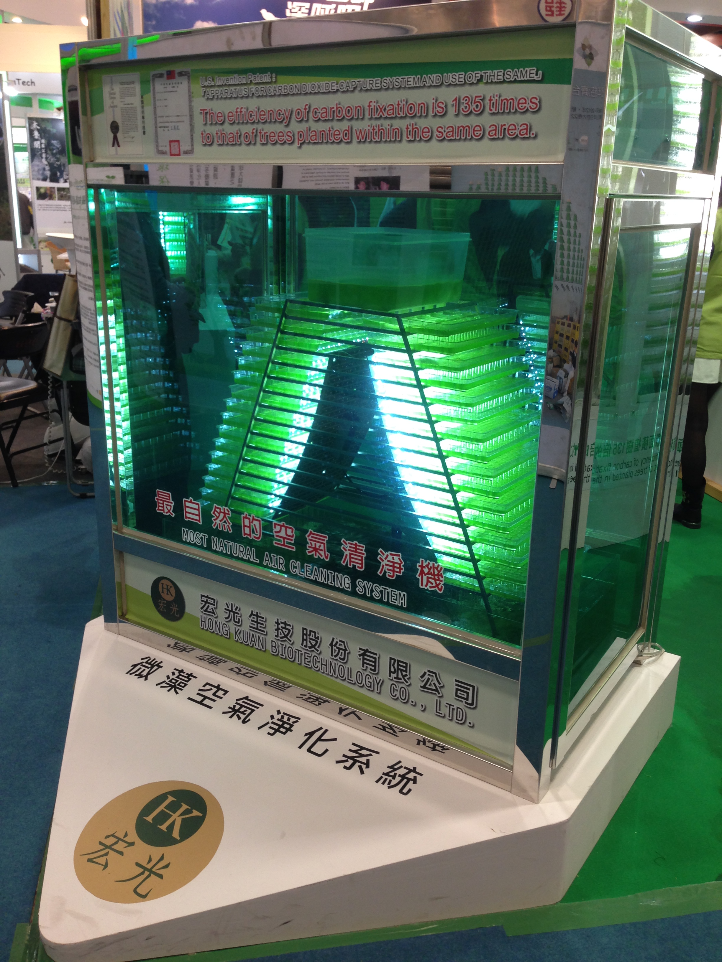 這些綠色的箱子,便是『宏光生技公司』最新的發明 - 『微藻空氣淨化系統』。根據該公司駐展人員的介紹,這套『微藻空氣淨化系統』主要的作用是能淨化室內過高的CO2、甲醛、細菌、病毒、輻射塵等空汙因子。藻類在『固碳』方面的功效,相信長期追蹤生質能源趨勢的讀者一定不陌生,2012年本站介紹的台灣電力公司微藻碳捕捉計畫便是『藻類固碳』的應用方式之一。只是在其他懸浮微粒及空汙因子的降低成效,筆者本身也是初次接觸。由於當下駐展人員沒有多著墨,筆者在整理這篇文章的時候順便收集了一下資訊。根據該公司董事長在接受訪問時的說法,這套系統採用單一品種的微藻,該微藻在細胞壁存在可吸附有毒物質的「特殊孢粉素」(sporopollenin),此系統便是利用它來粘附清除空氣中的有毒物質及空汙因子。