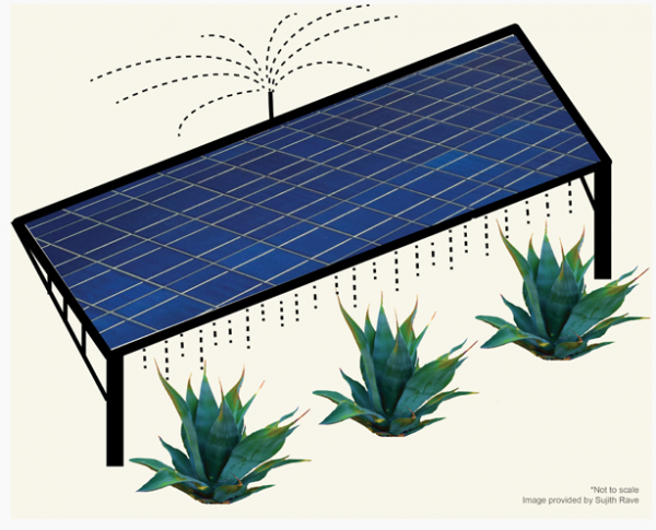 史丹佛大學的博士後研究員 Sujith Ravi指出,在沙漠中太陽能板可以有充足的陽光來產生電力,但是沙漠中的沙塵會很快的覆蓋太陽能板降低效率,因此需要使用水將沙塵沖除來維持產電效率。在太陽能板周圍以及下方種植沙漠植物可利用沖洗過後的水生長,並且固定土壤減少沙塵產生。這樣的系統可同時增加太陽能板產電效率、減少水資源消耗以及生產生質燃料。