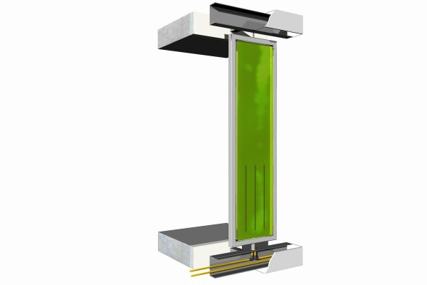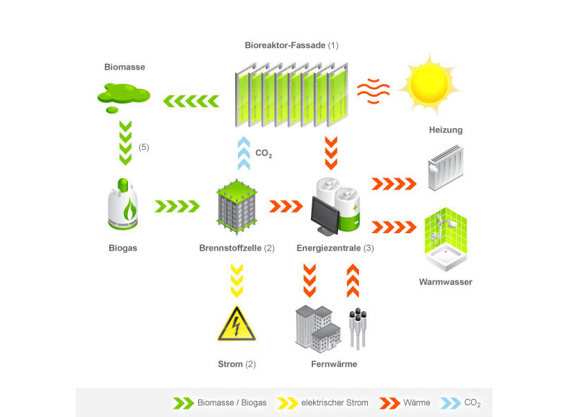 當藻類生長到一定濃度後,即可經由下方收集管集中收穫,然後藉由厭氧發酵或是熱裂解的方式製造沼氣,而這沼氣可經沼氣發電機或是燃料電池產生電與熱。電力可用來供應建築所需,產生的熱則可用來產生熱水、暖氣或是儲存於地下鹽水池以供日後所需。
