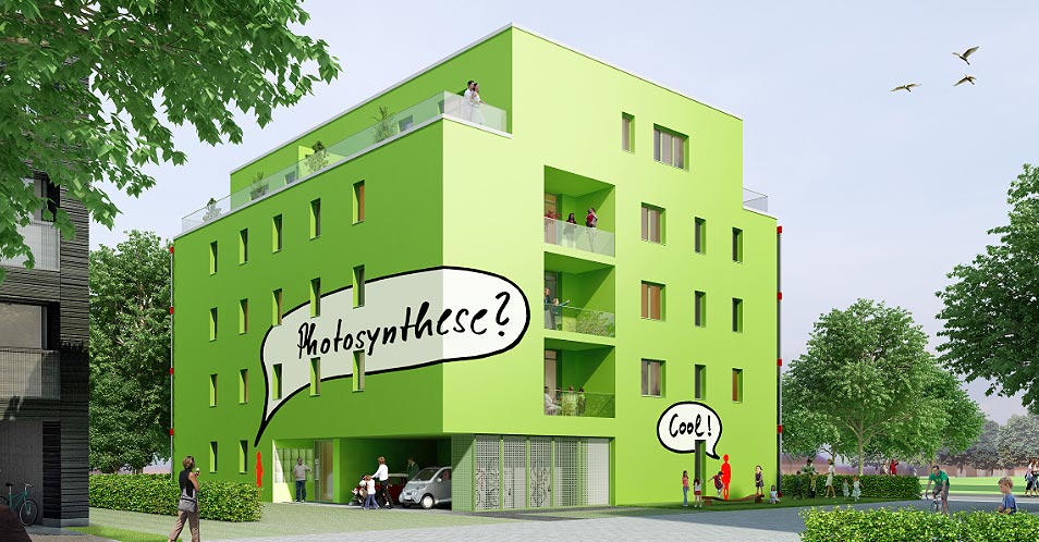 綠建築一般是指建築物使用環保材料並採用對環境影響最小的營建方式蓋成的建築物。台灣有名的綠建築諸如台北市立圖書館北投分館或是成功大學孫運璿綠建築研究大樓。但是今年三月在德國漢堡出現了一棟名符其實的”綠建築” –在建築外面的百葉窗培養綠藻以供應整棟建築的能源。這棟實驗性的建築叫做Bio Intelligent Quotient (BIQ),由建築師Splitterwerk設計而成,正在德國漢堡作為國際建築展展出。