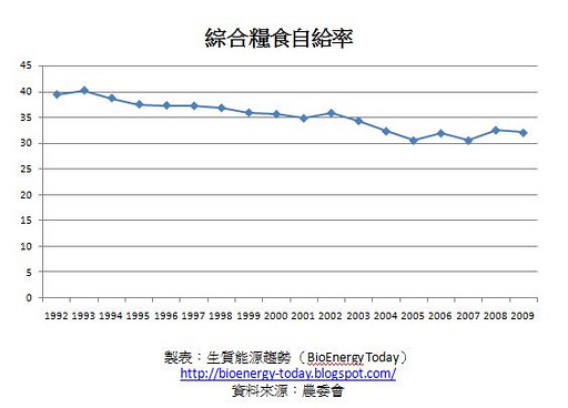 上圖顯示從1992年以來,台灣的糧食自給率有逐年下降的趨勢,2010年的綜合糧食自給率甚至只有30.6%。根據農委會提供的資料,台灣的稻米自給率達90%以上,但是由於島內氣候因素或是成本考量,其他穀類(如小麥、玉米、大豆)及各種動物飼料都相當依賴進口(自給率不足5%)。前一節有提到若一個國家對進口糧食的依賴程度較高,當糧食價格因各種因素(如氣候異常、出口國實施禁運、期貨市場炒作…等)高漲的時候,必須要付出更多的成本才能獲取足量的糧食,而台灣目前的情況卻正是如此。比較世界先進國家的綜合糧食自給率可以發現,即使撇除農業高度機械化的糧食出口國(如美國、加拿大…等)不談,與日本相比,台灣的糧食自給率仍然是偏低的。