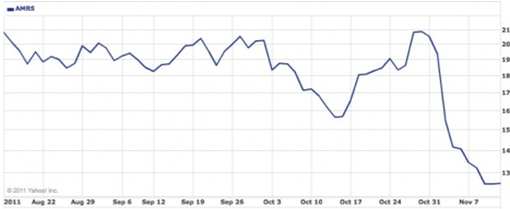 目前Amyris股價低於12元,創下了過去一年的新低,跌幅超過53%。Amyris去年(2010)上市時股價為16 元,低於每股18~20的預測。