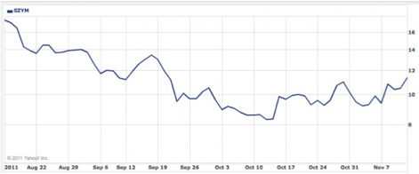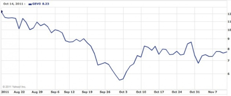 Gevo的商業模式為提供傳統玉米酒精廠升級的服務,讓它們能夠使用農業廢棄物之類的纖維素作為原料製成生質丁醇,之後可再加工作為塑膠及其它產品。在第三季裡的財務報表中,季營收為1751萬美元,相較去年同期為150萬美元。而本季淨損失為1231萬美元,與去年1731萬美元相比下降一些。在Gevo與Butamax的生質丁醇專利大戰裡我們提到Gevo最近陷入專利糾紛之中,官司的結果也忠實地反應在股價上。2011年12月15日可口可樂公司宣布將與Gevo合作研發100%生物材料塑膠瓶,這項宣布稍微拉昇了Gevo的股價。