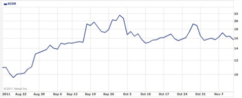 KiOR掌握著利用木屑作為原料,透過催化劑與熱反應生成粗油的技術。KiOR發佈了第三季淨損失為1480萬美元,去年同期淨損失為1060萬美元。目前為止KiOR尚未有任何營收,預計需要到2012年中在哥倫比亞的廠房完工之後才會開始產生營收。