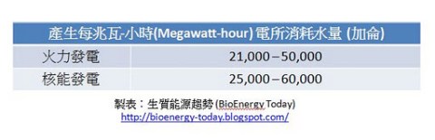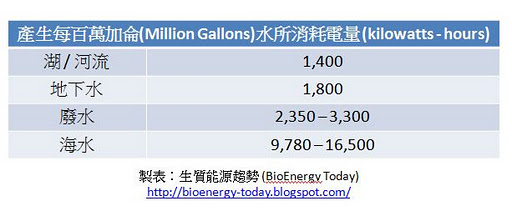 根據台灣經濟部水利署節約用水資訊網的資料,台灣平均每人每日用水量達274公升,以人口2,300萬計算,台灣每日消耗的水量為166.5百萬加侖(一加侖約為3.785公升)。根據表2提供的數據,即使以最省電的來源計算,台灣每日需要消耗233,100度的電才足夠供給我們當日消耗的水量。