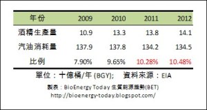 美國目前的燃料用生質酒精有兩種主要的市場,一個是E10酒精汽油,也就是一般汽油內添加10%的酒精;第二個是使用E85的彈性燃料車(FFV)。然而誠如我們在之前文章談過的,E85目前的普及程度太低,其影響程度與真正主宰市場的E10相比實在微不足道。假如美國國內市場一年消耗100億加侖的汽油,那麼生質酒精的市場規模最大就只有10億加侖(100*10% = 10),10億這個數字就是「Blend Wall」!要知道Blend wall在這兩年何以被頻頻拿出來討論,請讓我們由表1看起。