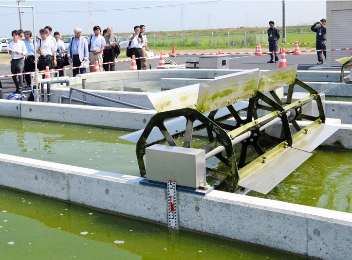南相馬市的市政府在受海嘯肆虐的海岸邊購買了1.2公頃的廢棄土地,提供給藻類工業發展協會建立藻類養殖場。目前藻類養殖廠利用跑道式水槽,以水車來進行水循環,並加入氮、磷以及二氧化碳來促進藻類生長。該協會的負責人筑波大學的教授Isao Inoue表示收集到的藻類生物質之後將會以熱水解液化法轉化為原油再行利用。